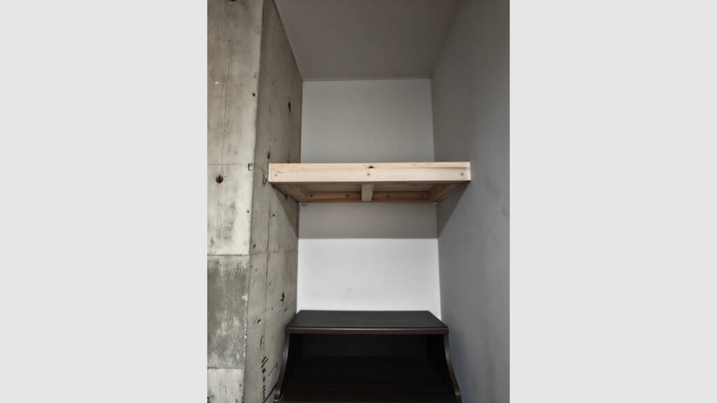 神棚を設置するための棚の造作工事をご依頼いただきました。設置場所はコンクリートの壁面でしたので、コンクリートビスと専用ボンドを併用してしっかりと固定し、神棚を安心してお祀りいただける棚に仕上げています。 お客様のご要望 神棚を設置するため... -