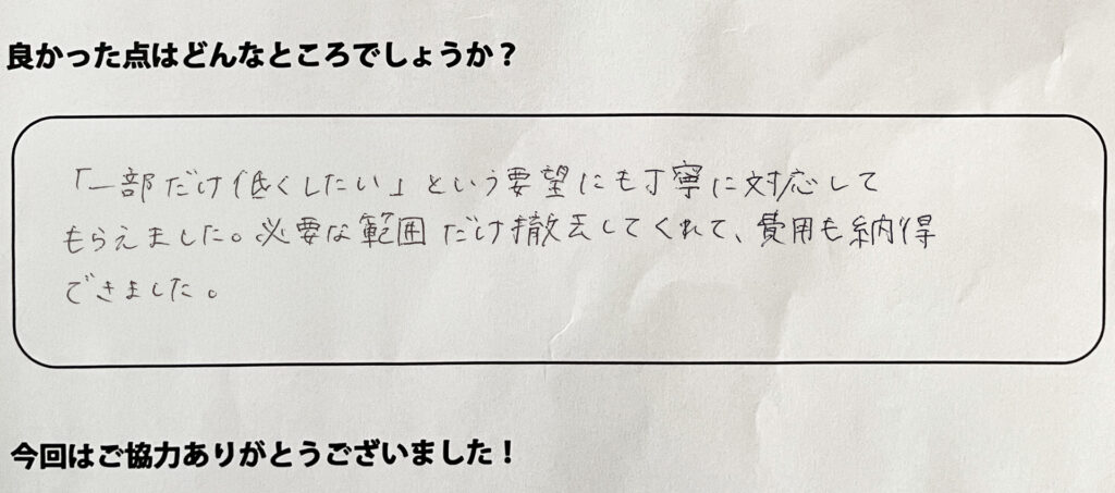 「一部だけ低くしたい」という要望にも丁寧に対応してもらえました。必要な範囲だけ撤去してくれて、費用も納得できました。