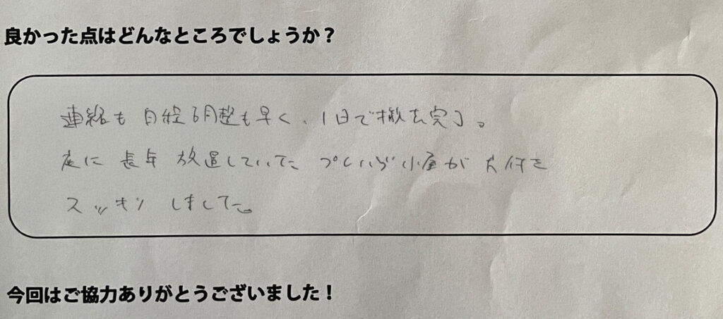 連絡も日程調整も早く、1日で撤去完了。庭に長年放置していたプレハブ小屋が片付きスッキリしました。