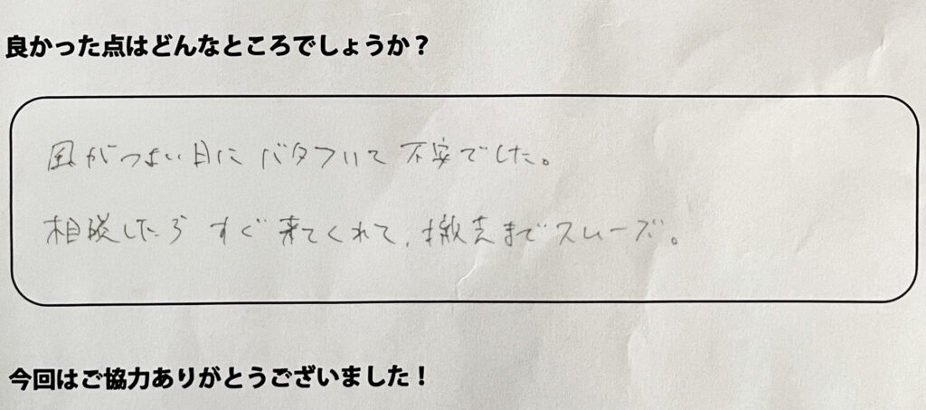 風が強い日にバタついて不安でした。相談したらすぐ来てくれて撤去までスムーズ。
