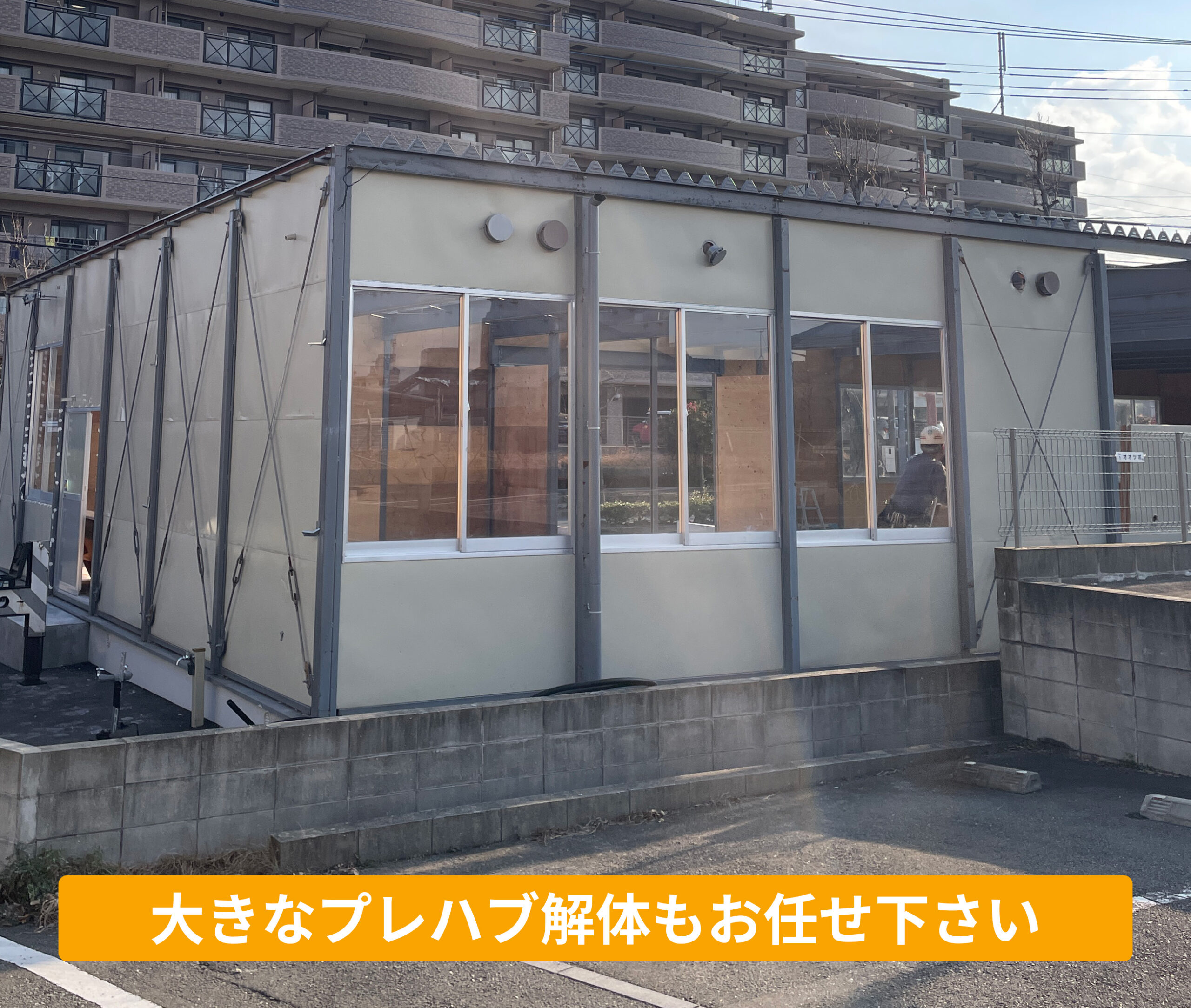 私たちは全国の職人と連携して安全なプレハブ解体作業を行っております。養生、近隣への配慮、搬出処分まで一括でお任せ下さい!