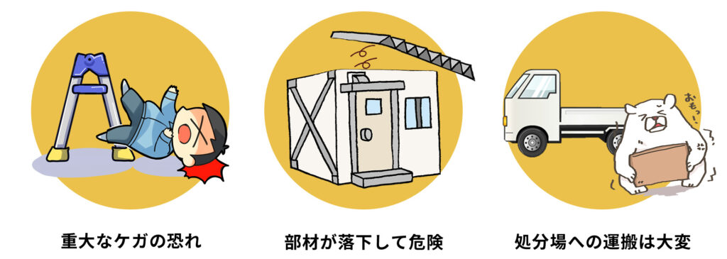 プレハブは、パネルや骨組みが大きく重いため、解体中に転倒・落下・手を挟むなど重大なケガにつながるリスクがあります。特に屋根まわりは高所作業になりやすく、フレームが倒れ自宅の外壁や車を傷つける原因になることも。古いプレハブほどサビや腐食で部材が外れにくく、想像以上に危険と手間が増えがちです。