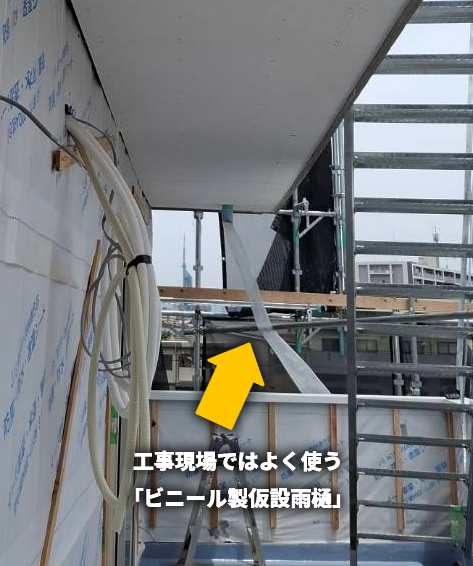 工事現場では、外壁塗装や屋根工事の際にビニール製の仮設雨樋(簡易樋) を使うことがよくあります。これは一時的に雨水の流れをコントロールするためのものです。