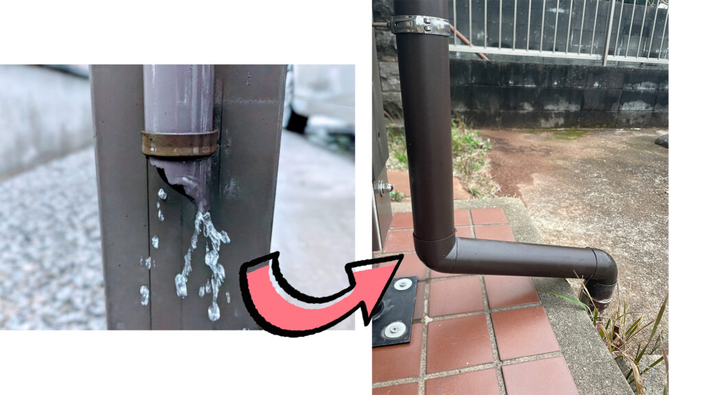 手が届く範囲であれば、ビニール製の雨樋に変えることで水の流れを変えることできます。ただし風が強く吹くと飛んでいったりするのであくまで応急処置という位置づけです。