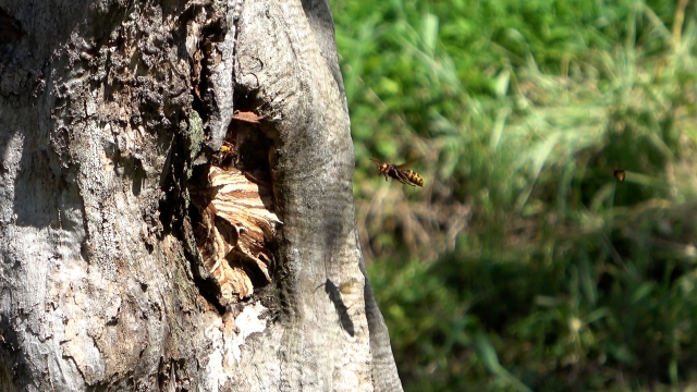 切り株の内部が空洞化すると、スズメバチが巣を作ることがあります。庭先で気づかず近づいてしまうと、刺される危険性もあるため注意が必要です。