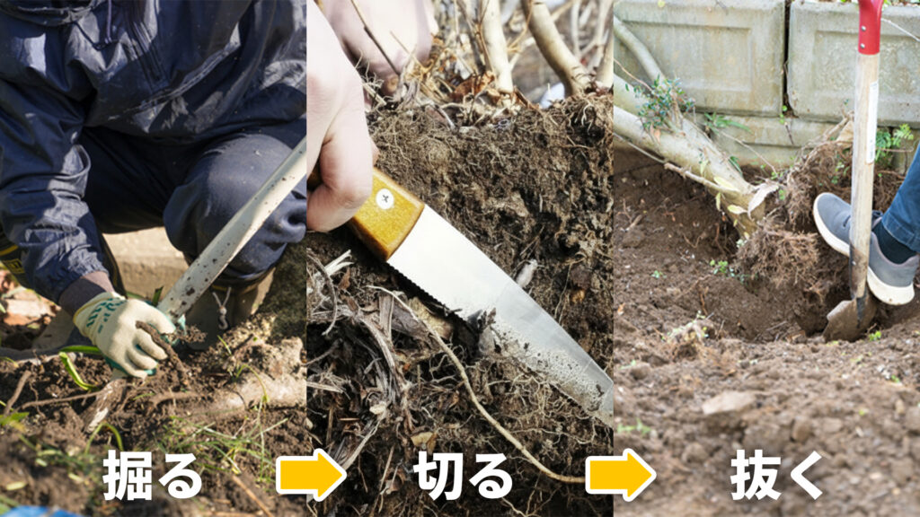 このように、単純に引き抜くだけではなく、事前にしっかり掘って根を処理する工程が必要になります。