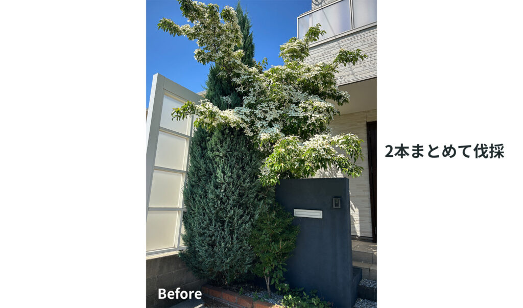 3m程度の庭木を2本、伐採+処分(抜根なし)で行った場合の実例です。