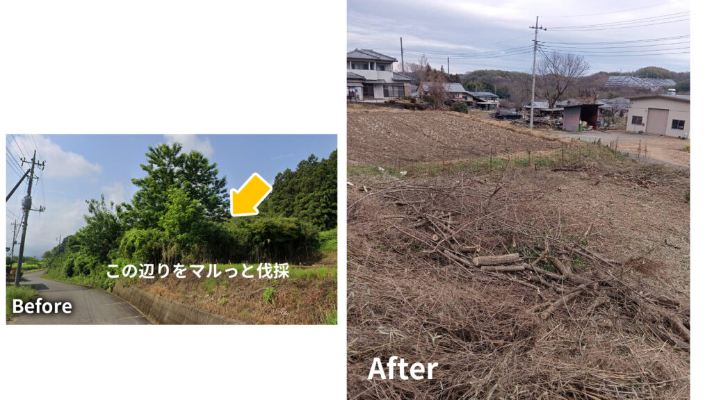 長年手入れされず、雑木林のようになってしまった畑(約200坪)をまとめて伐採したケースです。