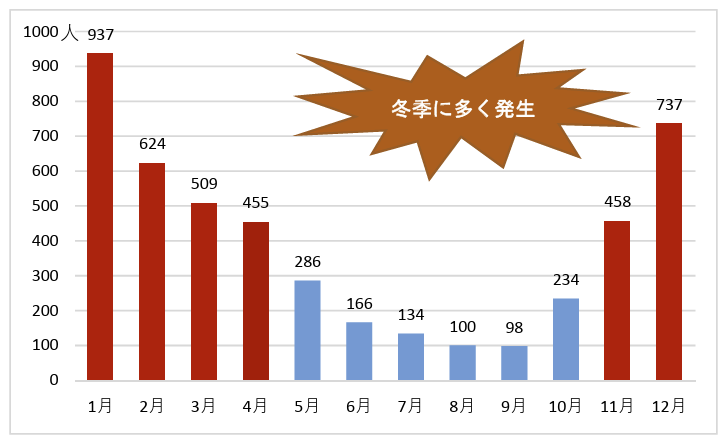 消費者庁が公表している「高齢者の不慮の溺死及び溺水」による発生月別の死亡者数(令和元年)を見ると、入浴中の事故は冬季に大きく増えることがわかります。