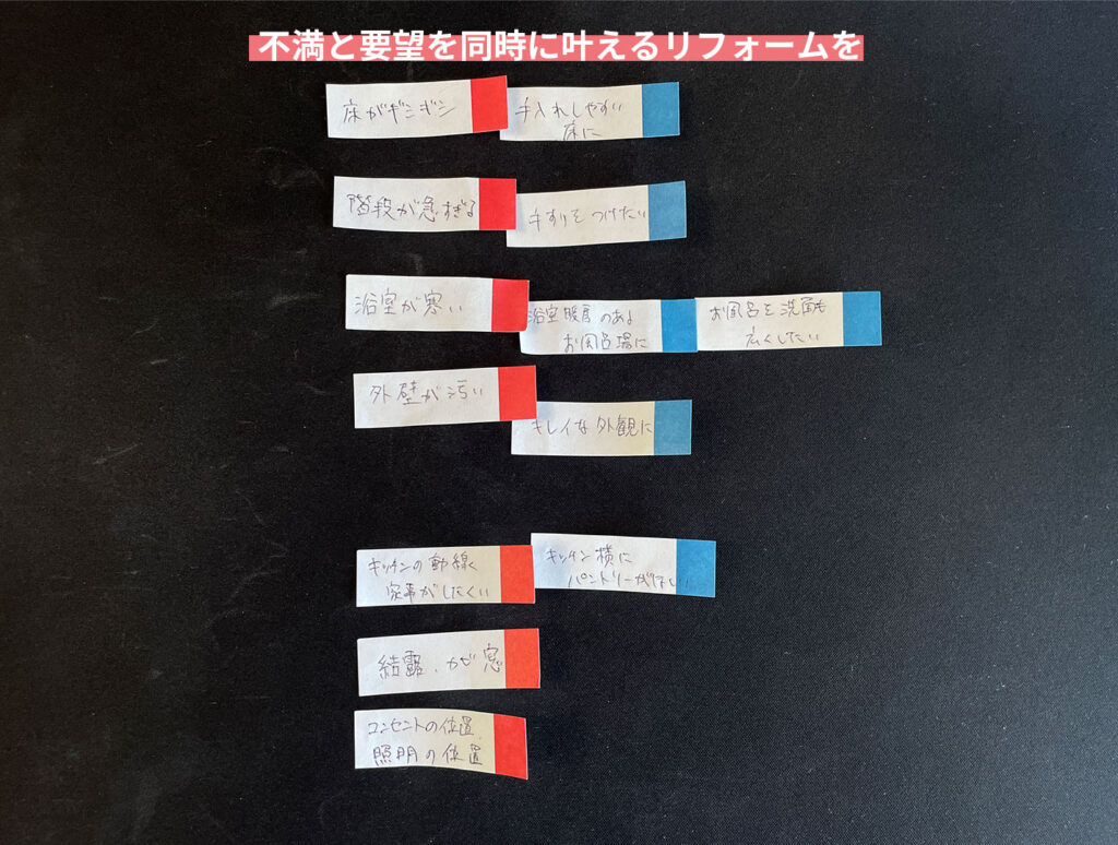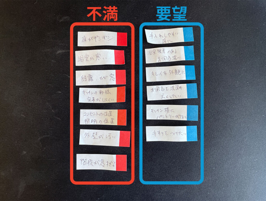 リフォーム計画の第一歩は、「不満」と「要望」を分けて整理することです。具体的なステップを以下解説致します。必要なのはポストイットとペンだけです。