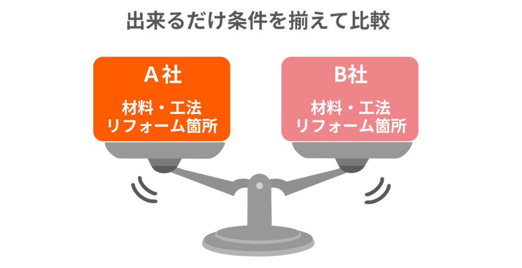 複数の見積を比較する際は、材料・仕様・リフォーム箇所などの条件を必ず揃えましょう。