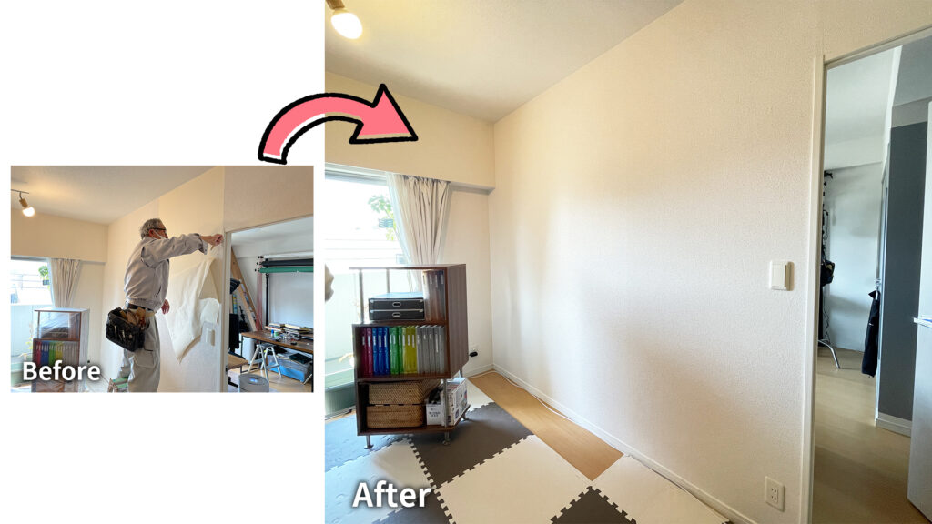 壁1面であれば半日〜1日程度、6畳程度のお部屋なら1日で完了することが多いです。下地補修がある場合は、もう少し時間がかかることもあります。