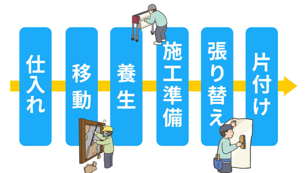 クロス張替えは、面積に関わらず職人の移動・準備・養生・施工・片付けといった工程が必要です。そのため、一面施工でも金額を調整し、最低2〜3万円程度になるケースが多いのが実情です。