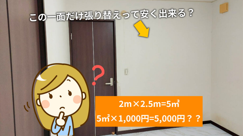 たとえば、壁1面(約2m×2.5m)であれば、面積は約5㎡。㎡単価1,000円で計算すると、5,000円程度に見えます。