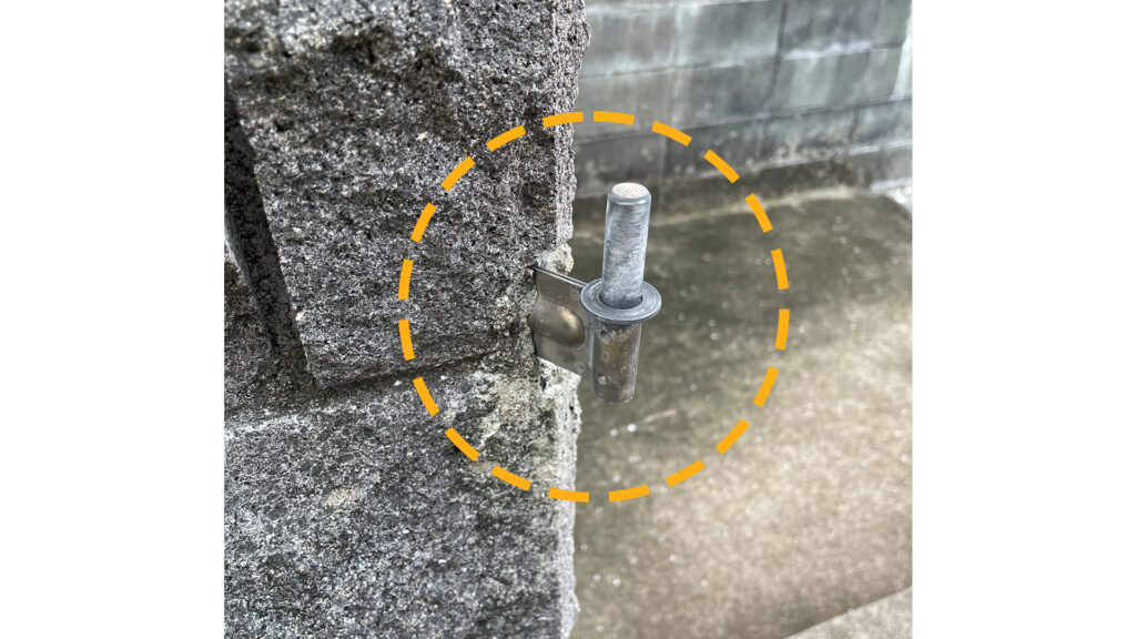 肘壺とは、門扉と柱を固定し、扉がスムーズに動くよう支える「つぼ状の金具」です。製品によっては「ヒンジ」や「調整金具」と呼ばれることもあります。