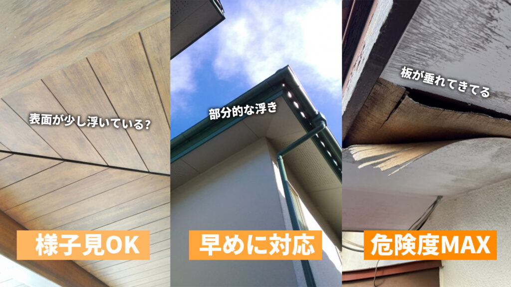 結論から言うと、軒天の剥がれは基本的に放置NGです。小さな浮きに見えても、内部では下地が傷んでいることもあり、固定力が失われていて突然落下する危険もあります。特に風でバタついている状態は要注意です。