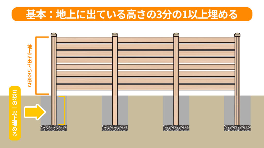 ウッドフェンスでは、地上に出ている高さの約1/3以上を地中に埋めるという考え方が基本になります。