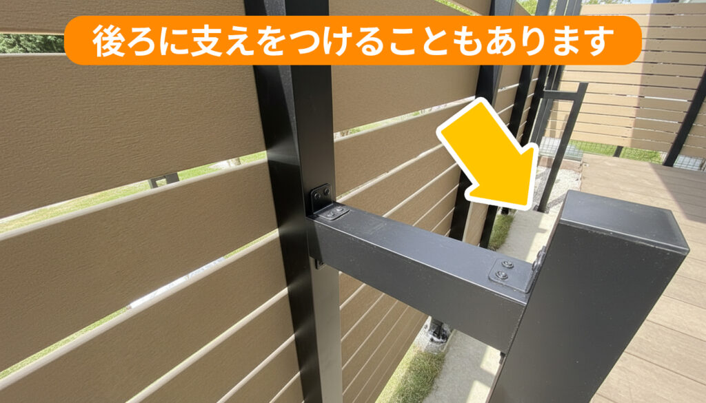 ウッドフェンスは、高さ・支柱の埋め込み・間隔を守っていても、条件によっては「支え(控え)」が必要になるケースがあります。