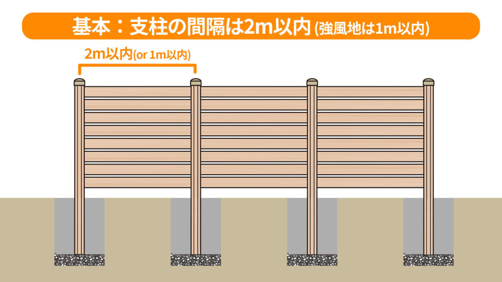ただし板が詰まった目隠しタイプや、風の影響を受けやすい立地の場合は、2m間隔では不十分なケースも少なくありません。その場合は、